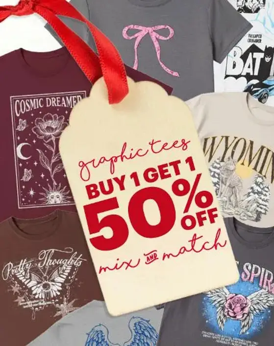 Get it fast! Shop in store and get graphic tees for buy 1, get 1 50% off.